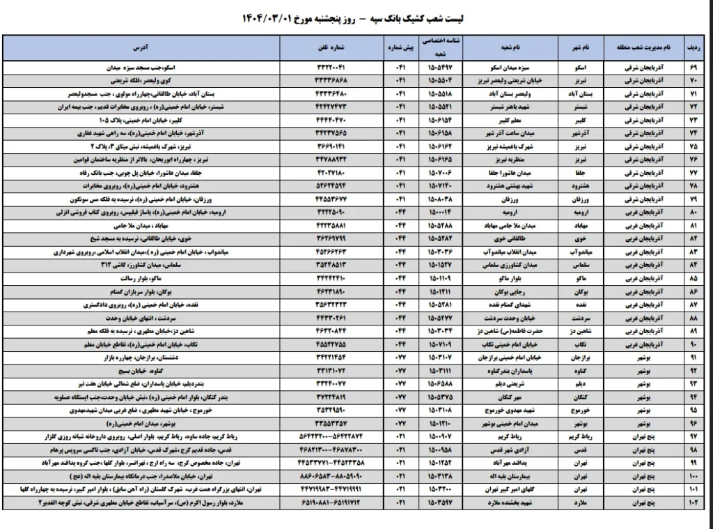 بانک سپه لیستی از شعب کشیک برای روز پنج‌شنبه منتشر کرده.