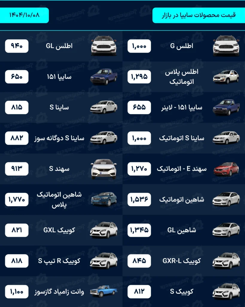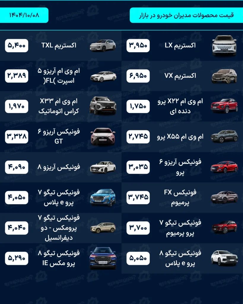 برای دریافت قیمت روز تمامی خودروها، مراجعه به بخش قیمت خودرو در وبسایت آخرین خودرو پیشنهاد میشود.